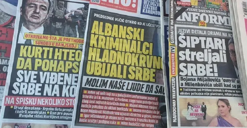 Александар Вучиќ сето ова го повторува една година, а медиумите под негова контрола ставаат такви насловни страници и додаваат квалификации како: „Курти зло“, „Курти сатана“, „Крвави планови на Албин Курти“, „Курти ја сака смртта на Србите“, „Курти сака да ги заколе Србите“ итн.