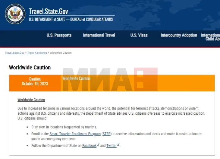 – Поради зголемените тензии на различни локации низ светот, потенцијалот за терористички напади, демонстрации или насилни дејствија против граѓаните и интересите на САД, Стејт департментот ги советува американските граѓани во странство да бидат особено претпазливи, се вели во соопштението.