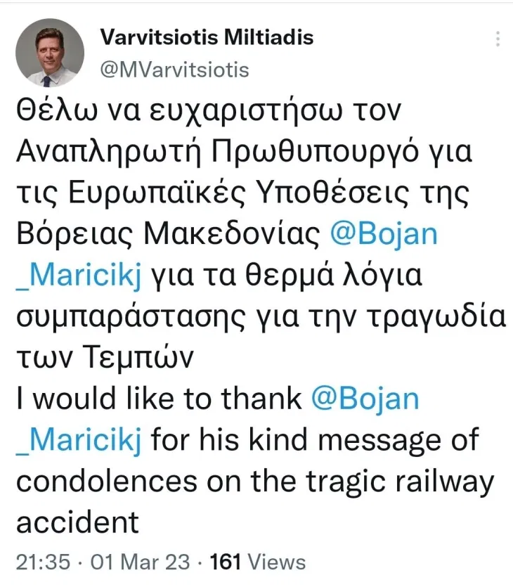 Алтернативниот министер за надворешни работи на Грција Милитиадис Варвициотис преку Твитер му се заблагодари на вицепремиерот задолжен за европски прашања Бојан Маричиќ за пораката со сочувство за трагичната железничка несреќа.