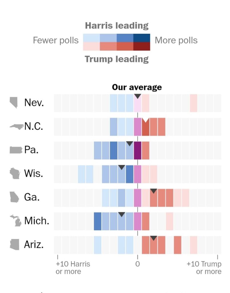 Заострувањето на анкетите во последните неколку недели продолжува. Додека потпретседателката Камала Харис сè уште е напред на национално ниво, како и во Пенсилванија, Мичиген, Висконсин и Невада, нејзината предност во Пенсилванија се намали на еден процентен поен. Доналд Трамп продолжува да води во Аризона, Џорџија и Северна Каролина. Харис води во 4 од 7 држави на бојното поле кои најверојатно ќе го одредат исходот од изборите, пишува Вашингтон пост.